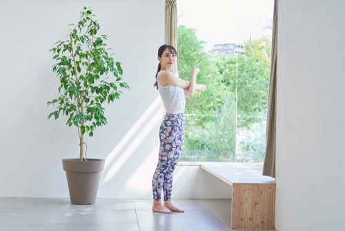 背筋を伸ばして立ち、まっすぐ前を向きます。TVなどを見てもOKですが、背筋が丸くならないように気をつけてくださいね。